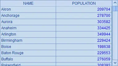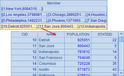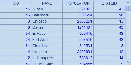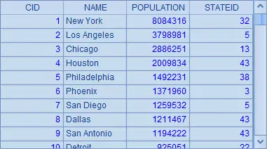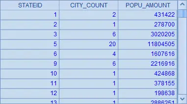 | 2 | =demo.query(“select STATEID,count(*) CITY_COUNT, sum(POPULATION) POPU_AMOUNT from CITIES group by STATEID order by STATEID”) |