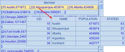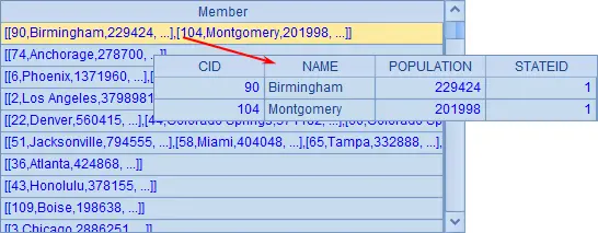 展示数据时,每个分组都可以双击查看,可以发现每个分组都是由1条或多条记录构成的。比如STATEID为1的城市有两个:Birmingham和Montgomery。