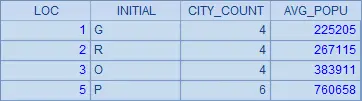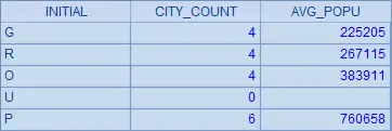 | 4 | =A3.new(A2(#):INITIAL,~.count():CITY_COUNT, int(~.avg(POPULATION)):AVG_POPU) |