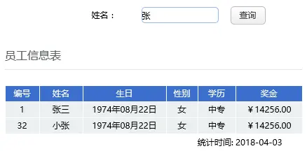 到这里数据呈现区域的样子搞定了,接下来,我们看一下查询部分的name传递过来后数据呈现区域是怎么接收应用的,我们先看一下怎么定义接收name。