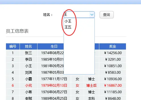 上面栗子1号是模糊查询的一种很很很常规的用法,下面我们对栗子1号做一丢丢修饰,变身栗子2号,目的是为了当编辑框键入“王”时,下拉选项中将所有与之相关的选项筛选出来,以缩短下拉选项较多,通过滚动条寻找某个项使用的时间,如下(图二)