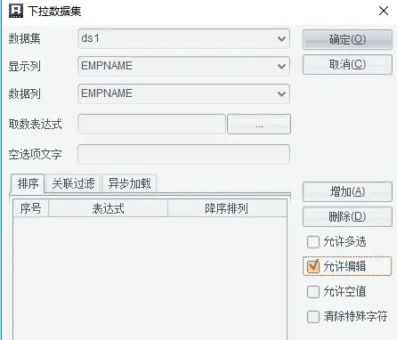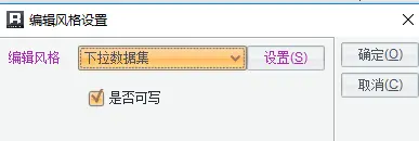 之后,点击“设置”,并在弹出界面中指定数据集、显示列、 数据列同时勾选“允许编辑”,如下