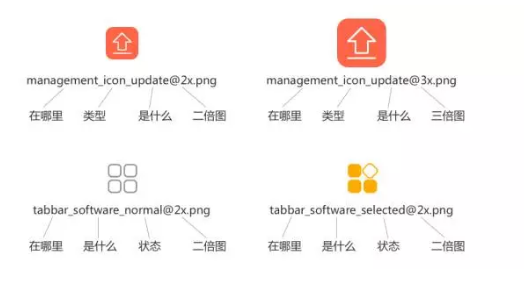 举例:tabbar_icon_home_default@2x.png(对应中文:标签栏_图标_主页_默认@2x.png)