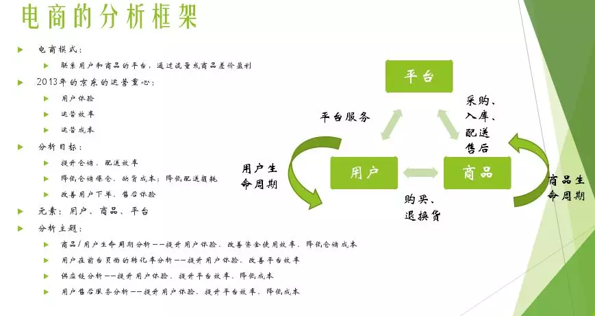 我们以电商的例子来说明,如何搭建分析框架。首先我们要分析电商的商业模式是什么,电商是一个平台,一头连接用户,一头连接商品。平台提供采购、入库、配送、售后,同时平台还提供搜索等互联网服务,用户卖完商品可能还存在退货。电商模式包含三个元素,用户、商品、平台。除了模式,还需要运营重心,以13年京东运营重心举例,重心是要提升用户体验、运营效率、降低运营成本。所以分析目标随着业务目标生成:提升仓储、配送效率,降低仓储爆仓、缺货成本,降低配送损耗,改善用户下单、售后体验。分析目标和运营目标最大的不同就是:分析目标是业务目标按照元素进行拆分的,比如用户体验分解为下单和售后,下单体验其实还可以划分(比如搜索,导航栏),也就是说分析目标是按照运营目标与运营模式里面的元素的关系进行拆解得出的。有了目标我的分析主题就确立了,分析目标和主题最大的差异是:分析主题是为了完成分析目标,但是主题会涉及多个元素,比如商品的用户生命周期分析,因为做了分析就能提升用户体验,如果把每个商品做一个生命周期分析,比如新的商品,卖的比较好的商品,这种比较优先推荐给客户,那么他体验好,减少退换货,这就是将用户体验在购买阶段做了再拆解,在用户维度做生命周期分析和在商品维度做生命周期分析,做用户生命周期分析也是为了提升用户体验,比如一个刚来的用户和一个成熟的用户和一个要走的用户,刚来的用户你要让他感受平台的优势(让他看到物美价廉的商品),其实用户养成习惯后慢慢就不在乎价格,慢慢就会关注体验本身(送货快不快,包装好不好,如果产生退换货,流不流畅等),所以如果知道用户处于什么生命周期,那就可以给这个生命周期用户更好地体验。比如退换货,京东配送员资源有限,谁先退货这就取决你的生命周期和价值,肯定优先老用户和价格比较高的,来给他更好的体验。