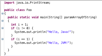 但我们要深入到 class 文件中去看看 JVM 对于这段代码,它到底是怎么执行字节码指令的。于是我们使用 javac 命令得到它的 class 字节码文件: