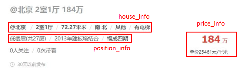 接下来开始对房源列表 house_info_list中的每个房源信息info进行解析。根据链x的页面结构,可以看到,每个info下有三个不同位置的信息组,可通过class_参数进行定位。这三个位置信息分别是house_info,position_info,price_info,每组位置下包含相关字段信息。