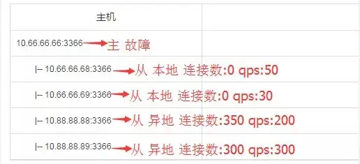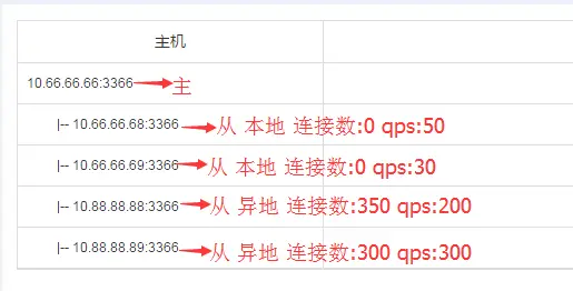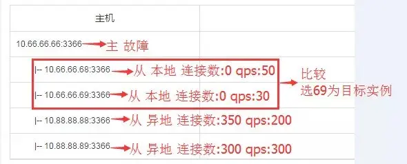 - 选目标实例,假如例子中的4个从都是存活的,那么根据先本地后异地原则,选出10.66.66.68:3366,10.66.66.69:3366,然后再去查连接数,在连接数都相同的情况下,则去比较QPS,选出QPS负载低的10.66.66.69:3366作为目标实例: