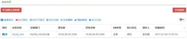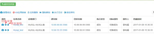 监控系统会自动创建任务,并根据先本地后异地原则,然后再查连接数、QPS,确定目标实例为10.88.88.88:3366,进行自动切换,DBA可在切换任务列表查看详情。