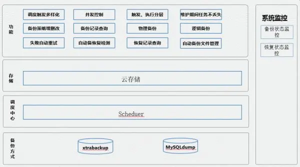 备份系统每次备份时都会进行实例健康状态检查、备份运行状态检查等,防止对无效的数据库实例进行备份;恢复系统主要是在需要进行数据恢复、弹性扩容等等需要从备份文件恢复成运行的数据库实例时使用,能够让DBA通过简单地操作即可完成数据的恢复;恢复检测在调度系统的指挥下自动对备份文件可用性进行检测,来帮助DBA及时发现不可用的备份文件;备份失败有些是能够通过失败自动重试来解决,但有一部分是重试所不能解决的,需要进行相应修复,因此开发了自动修复系统来自动修复因为环境等问题引起的备份失败。