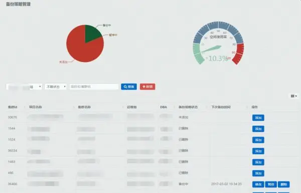 备份策略管理的页面包含了备份状态分布情况、存储使用情况以及每个集群的当前备份策略状态,如果已经添加了备份策略则可以在这里进行(时间、服务器、备份方式)修改、暂停(继续)、删除操作,如果没有添加备份策略,则可以进行添加。