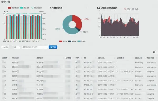 备份详情里面展示了最近备份总数、成功数、成功率、当天备份任务运行状态、备份任务24小时分布曲线图以及备份详细记录。备份详细的记录可以根据集群名、项目名等信息进行查询,方便DBA更好地掌握备份运行状况。