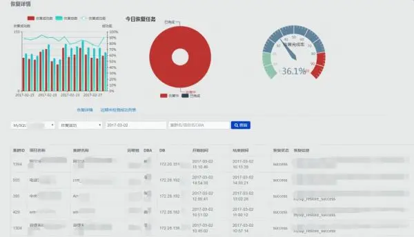 恢复检测页面包含最近每天恢复检测数、恢复检测成功数、成功率柱状图、当天恢复检测任务运行状态饼图和近期恢复检测完成率,有助于DBA对恢复概况有更清晰的了解。