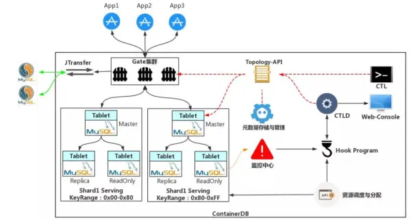 ContainerDB针对每个业务应用都有逻辑库,逻辑库中定义了针对整个业务所有表的拆分键(Sharding Key)进行哈希取模运算时模的范围(KeySpace),在每个逻辑库中可以创建多张表,但是每个表中必须定义Sharding Key。通过该Sharding Key将表中的数据拆分成多个分片(Shard),每个分片都对应一个KeyRange,KeyRange表示对Sharding Key进行哈希取模运算之后得到的值(Sharding Index)的一个范围,每个Shard都由一整套MySQL主从架构提供数据库服务支撑。应用程序只跟Gate集群进行交互,由Gate根据元数据信息和SQL语句完成数据写入和查询的自动路由。ContainerDB中的监控中心会对所有的基础服务和资源使用状况进行实时监控,并通过在监控中心注册的Hook程序自动进行动态扩容、故障自愈、分片管理等,而这一系列操作对应用程序来说是完全无感知的。