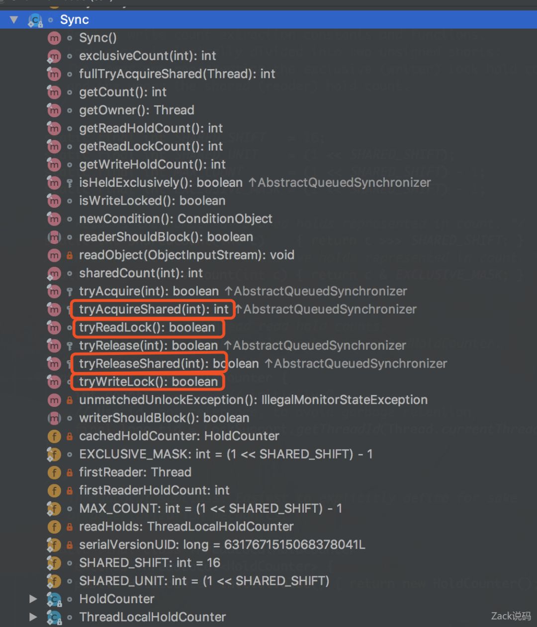 对比之前ReentrantLock的Sync,最大不同在于它多了**shared()方法,用于共享锁的获取与释放。另外tryReadLock()、tryWriteLock()是给WriteLock和ReadLock内部类使用的。