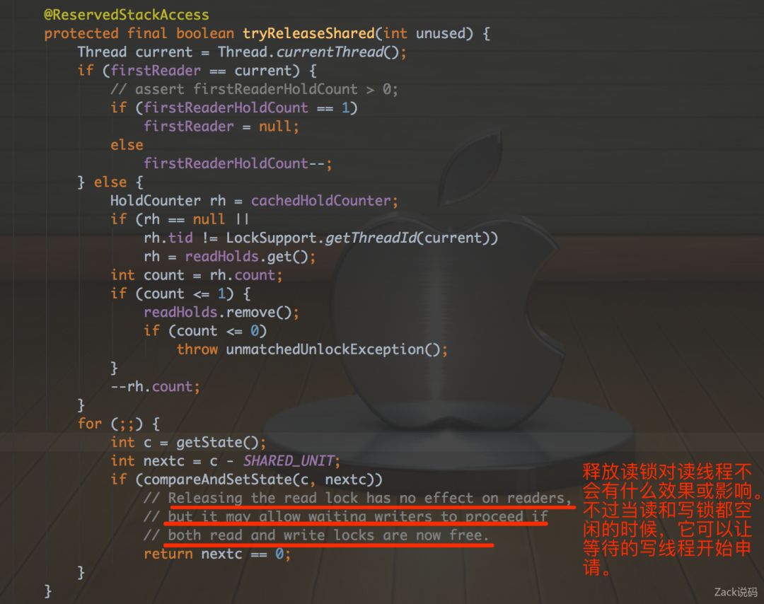 释放读锁,对正在读的线程不会有什么影响,但可以让等待的写线程去开始获取写锁。剩余的内容就是对tryAquireShared()计算的count数值进行释放(自减),如果最终自减为0则释放读锁成功。