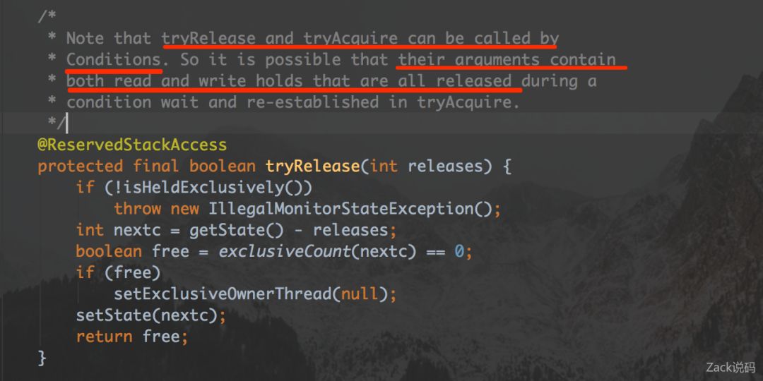 这里又有Condition的踪迹了,大概可以才行到Condition时控制锁的行为的,取消唤醒等操作。另外锁会同时释放读锁和写锁。这个方法比较好理解的,只要是当前线程操作下,持有重入数减去释放数为0就可以释放了,否则失败。