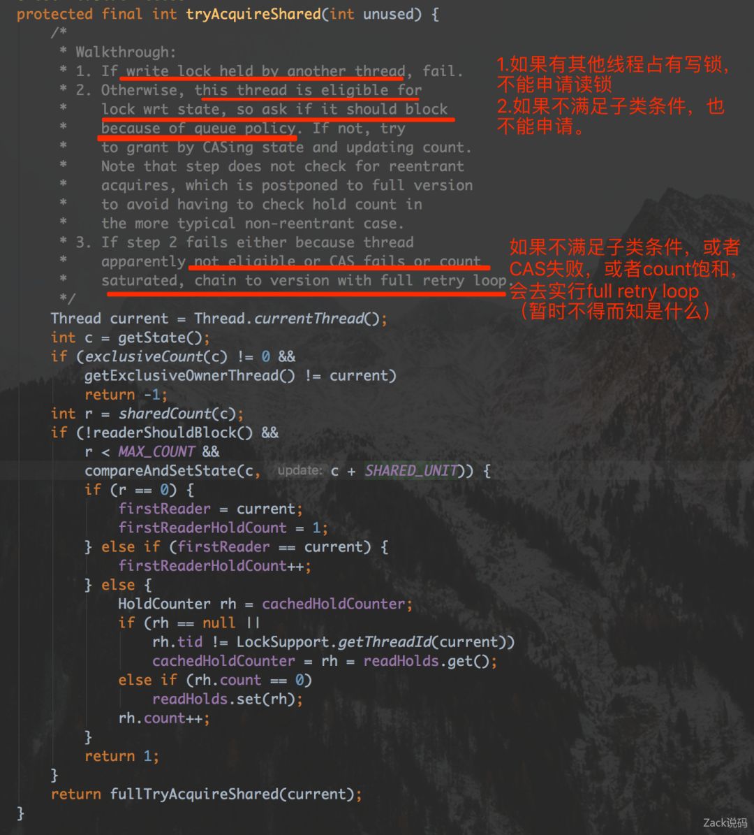 先判断是否有写锁占有,如果写锁不是当前线程,获取读锁失败,退出方法。注意如果写锁是当前线程是可以获取读锁的,因为写锁是独占的,这种情况下是不会有数据与其他线程共享的问题。满足子类条件,也不超过总数,CAS也成功的情况下,如果没有读锁,则设firstReader为当前线程,firstReaderHoldCount为1;如果有读锁,并且也是当前线程申请获取,firstReaderHoldCount自增1;如果有读锁,不是当前线程申请,取上一个成功的缓存计数器,如果这个计数器不是当前线程的,则设为当前的计数器,并且自增,返回成功。(其实就是把缓存计数器置换为当前线程的计数器)最后不满足条件或者CAS失败,执行fullTryAcquireShared(current)返回。至于这些数据算来干嘛,等后面看看release()怎么用。
