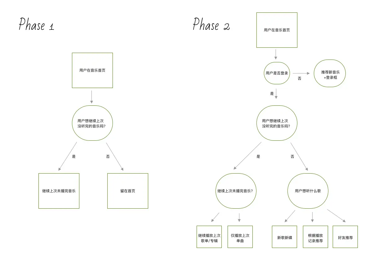 在草图1阶段(左图),做一个规则判断:用户来到页面是否要继续上次的音乐?就这么简单,然后针对规则做出解决方案,最后的目标是“用户成功播放喜欢的音乐”。
