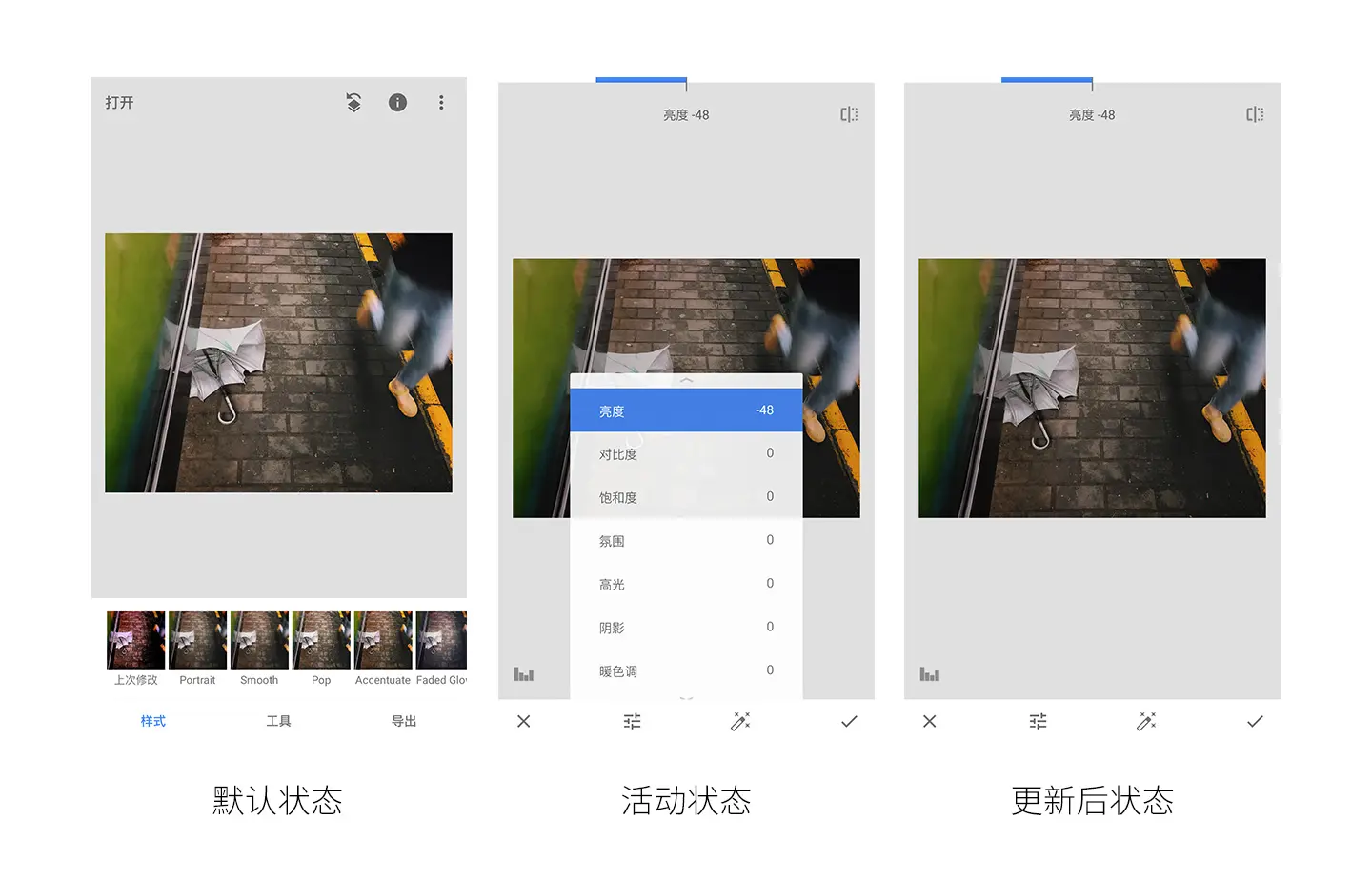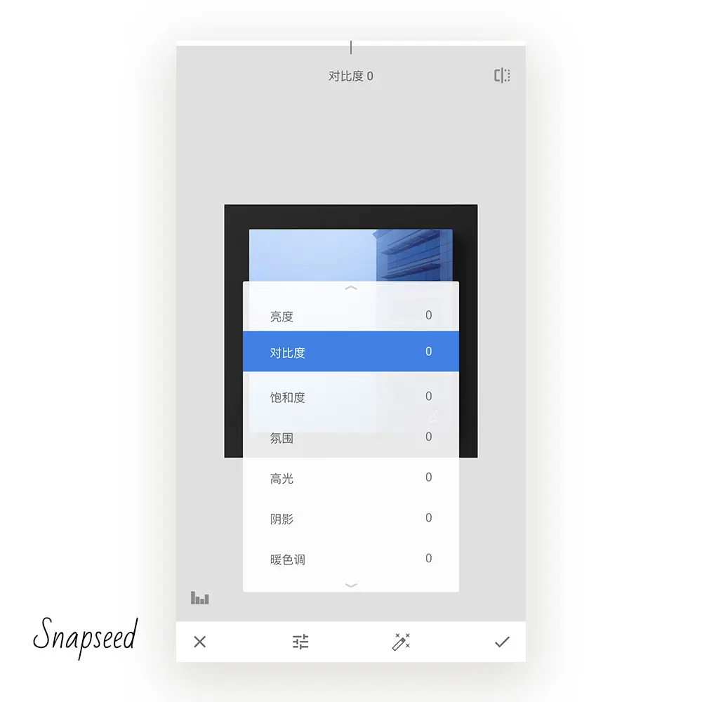 我最喜欢的手机照片处理应用Snapseed,它将后期处理的最基本工具打包在一个屏幕中,仅仅通过左右滑动和上下滑动,就可以快速的对照片进行基本调整,而相比大部分照片处理应用,这些基本功能都被拆分成很多块,放在不同的入口中,使用起来实在麻烦。