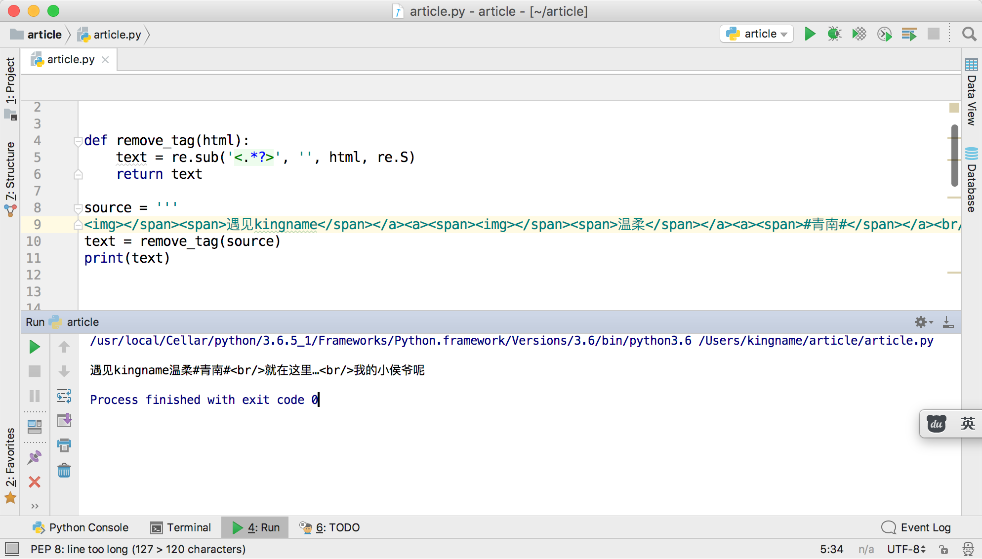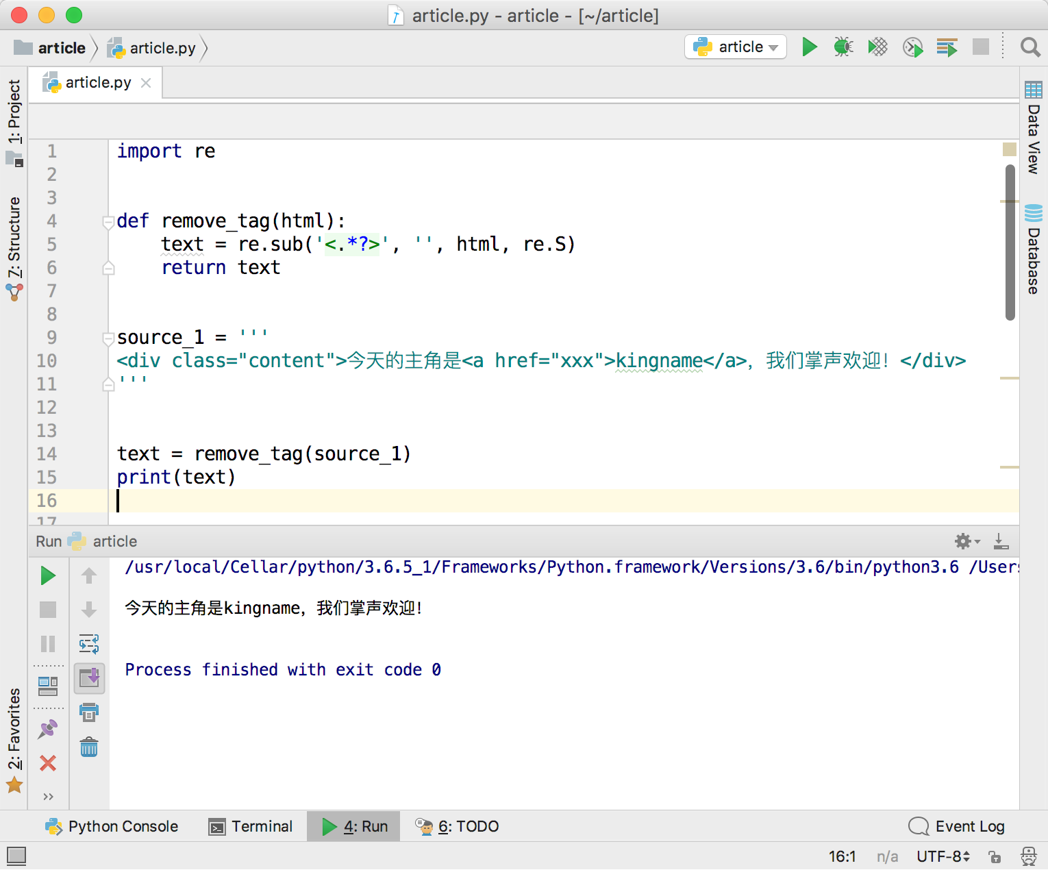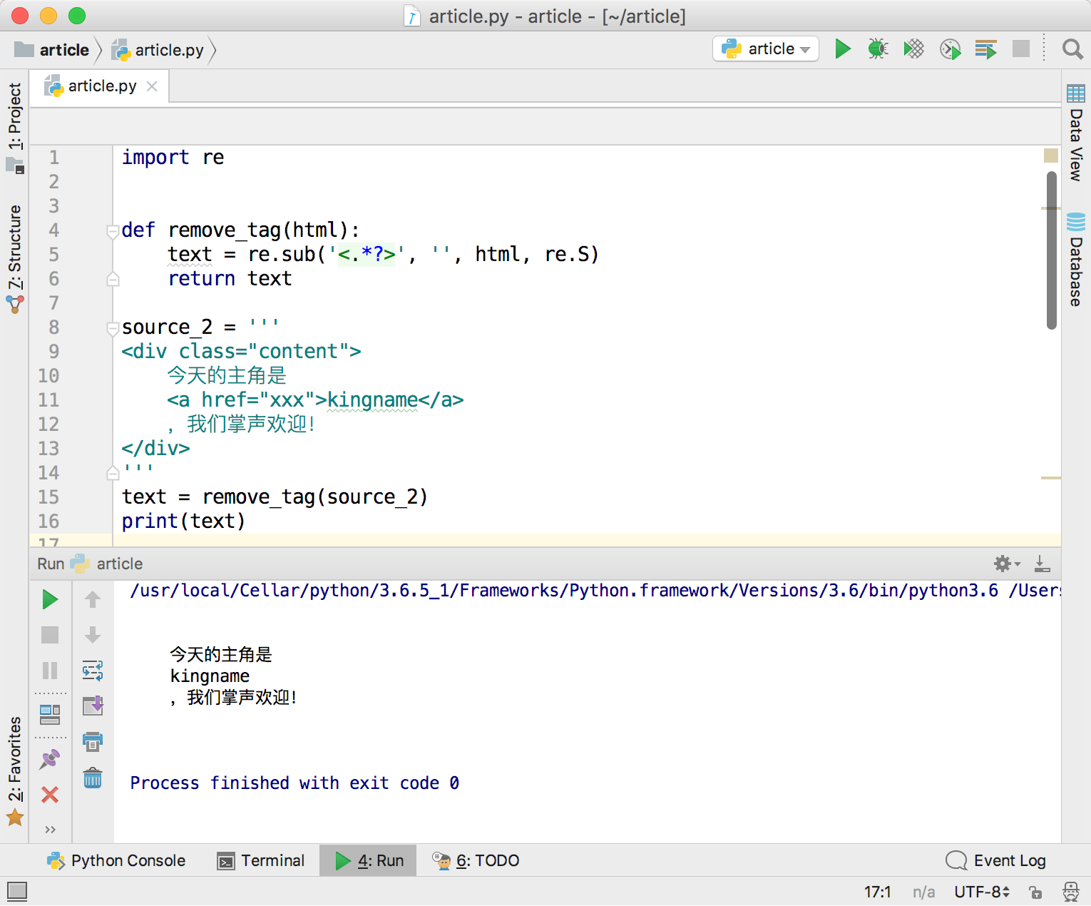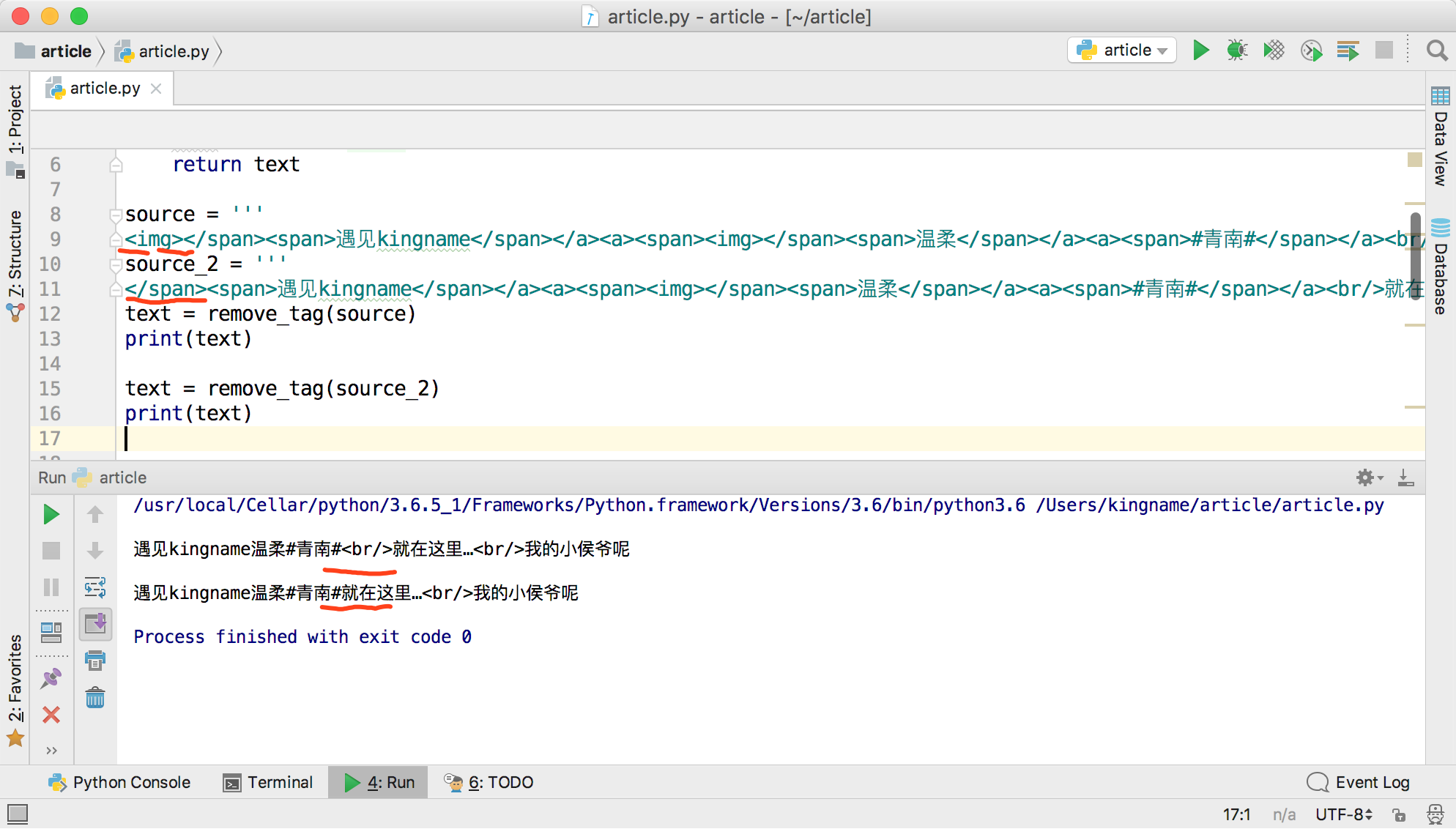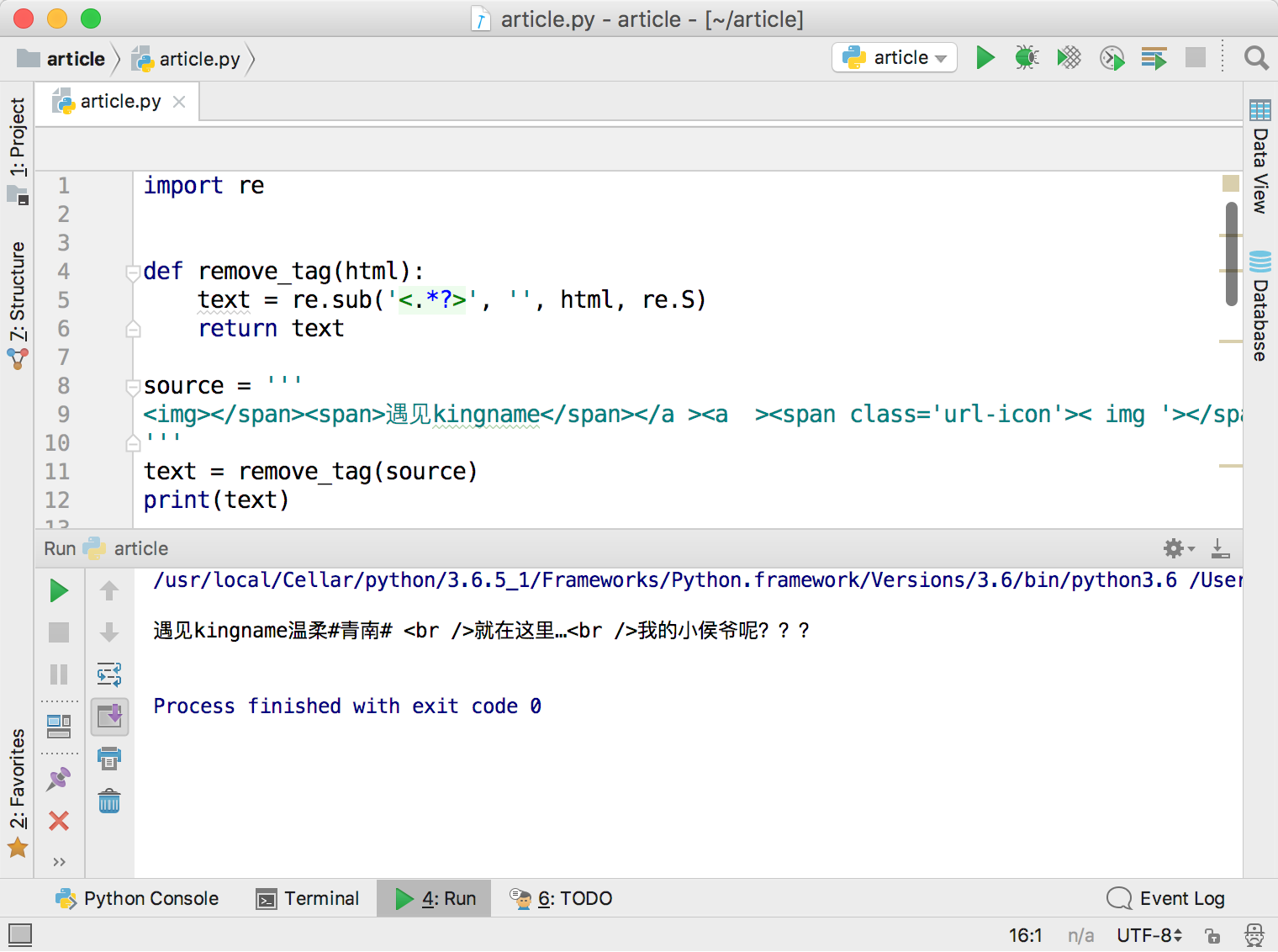 问题的起因来自于一段正则替换。为了从一段HTML代码里面提取出正文,去掉所有的HTML标签和属性,可以写一个Python函数: