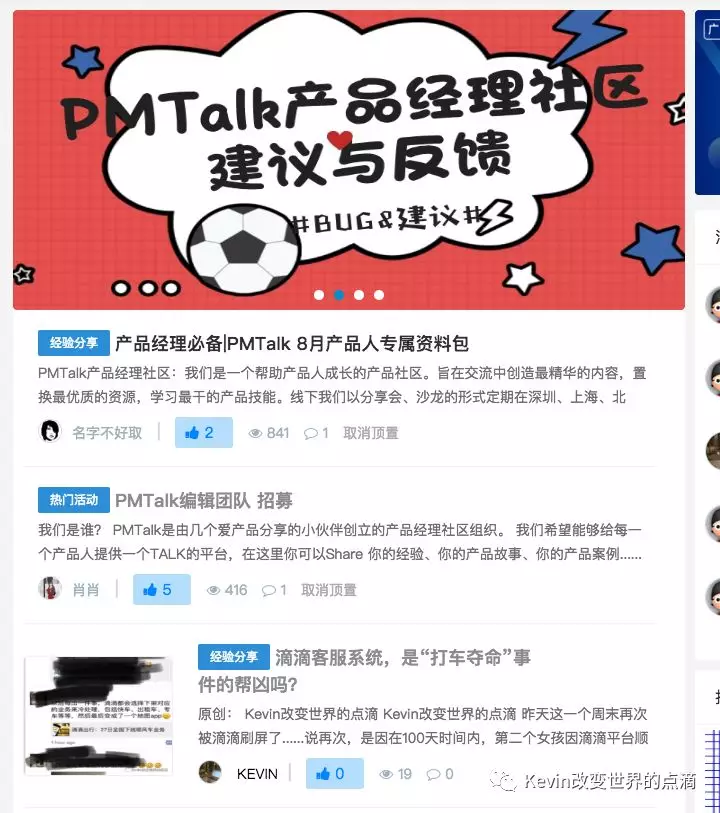 用户反馈的设计要根据自己的产品类型和产品形态进度独立考虑。比如web社区PMTalk产品经理社区就直接采用了发帖的广告位作为反馈渠道,不需要额外开发。