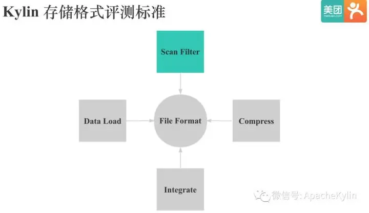 在我们为Kylin新增一个存储引擎之前,我们自然就需要先了解Kylin的存储引擎组成。主要有5部分:存储格式,Cache,计算,调度和元数据。 计算指数据的Scan,过滤,聚合等,调度指文件增删,复制和负载均衡等,这里的元数据指的是存储引擎本身的元数据。其中存储格式对查询性能影响很大,也是HBase在Kylin查询场景下的痛点,所以我们决定首先去寻找或改造一个适合Kylin的存储格式。