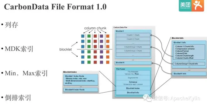 由于Parquet过滤性能不足,所以我们就Pass了Kylin On Parquet的方案。 Parquet之后,我们又调研了当时新起的华为开源的存储格式CarbonData。和Parquet类似,CarbonData首先将数据水平切分成若干个Blocklet,Blocklet内部按列存储,每列的数据叫做一个Column Chunk。和Parquet不同的是,CarbonData拥有丰富的索引:MDK索引;Min,Max索引;倒排索引。MDK索引是多维度索引,类似Kylin中的维度索引,整个文件会按照多个维度列进行排序,这样对MDK列中的维度进行前缀过滤就会很高效。