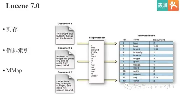 Parquet,CarbonData之后。 我们差不多同时进行了Kylin On Lucene POC 和 Kylin On Druid POC。我们先来看下Lucene, Lucene大家应该都很熟悉,是一个被广泛使用的全文搜索库,其存储格式是基于MMAP,支持倒排索引的列存。