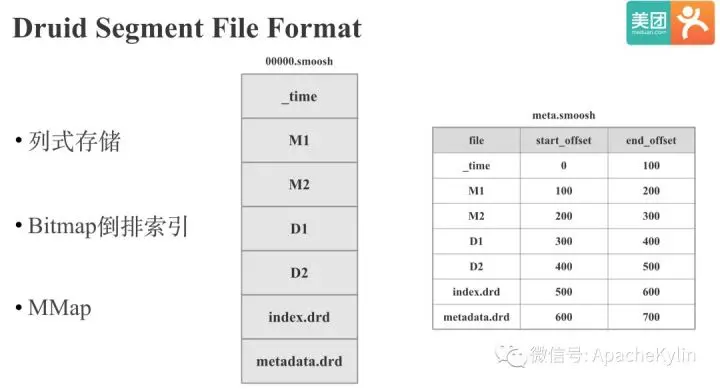 下面我们来看下Druid的存储格式。和Lucene类似,Druid的存储格式也是基于MMAP,支持倒排索引的列存,区别是Druid的倒排索引是基于Bitmap的,Lucene的倒排索引是基于倒排表的。Druid的存储格式比较简单,就是直接按列依次存储,其中的M1,M2是指标列,D1,D2指维度列.除了数据文件之外,还会有一个meta文件记录每一列的offset。我们要读取Druid文件时,就将Druid文件MMap到内存,直接根据offset读取指定偏移量的数据。