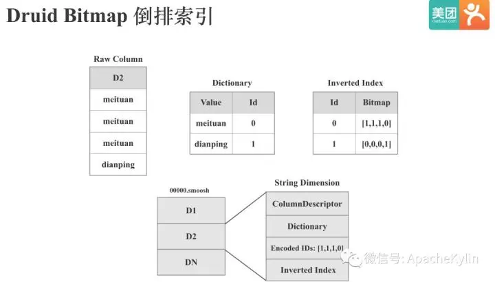 图中上半部分是Druid Bitmap 倒排索引的实现原理:我们有维度列D2, 共4行数据,包含meituan,dianping两个值,Druid会首先对维度列进行字典编码,图中meituan编码为0,dianping编码为1,然后Druid会基于维度值和字典构建基于Bitmap的倒排索引,倒排索引的Key是编码后的ID,Value是Bitmap,Bitmap的哪个bit位是1,就表示该值出现在哪些行。 下半部分是Druid String 维度存储的具体内容:包括列的元数据,维度字典,维度编码后的ID和倒排索引。