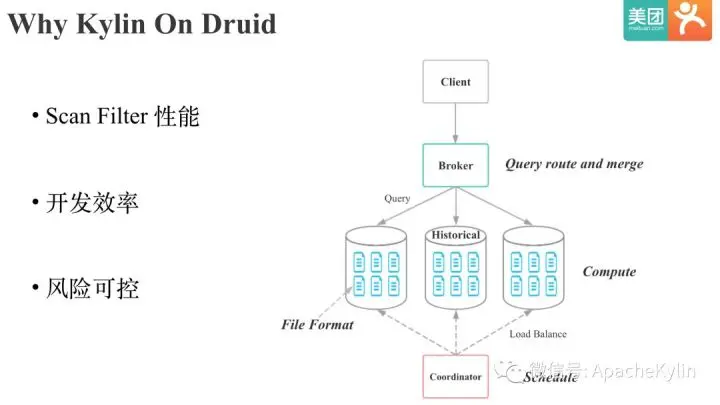 - 其次是Druid不仅仅是一个存储格式,而是可以作为一个完整的Kylin存储引擎, 比如Druid Historical节点负责Segment的Cache和 计算,Druid Coordinator节点负责Segment的增删,副本和负载均衡。这样我们就不需要基于存储格式再去演进出一个存储引擎,我们整个项目的工期会大幅缩短。