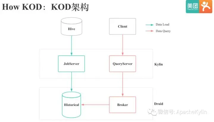 图中是Kylin On Druid 简化后的架构图,分为数据导入和数据查询两条线。数据导入时,Kylin的JobServer会将Hive中的数据导入到Druid的Historical节点中;数据查询时,Kylin的Queryserver会通过Druid的Broker节点向Druid发起查询。