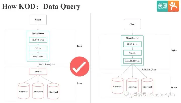 KOD的数据查询过程,Kylin和Druid如何交互我们可以有两种方案。 一种是通过直接访问Broker的方式和Druid集成,一种是通过直接访问Druid Historical节点的方式和Druid集成。 第一种方式我们只需要将Kylin的SQL翻译成Druid的json,通过Http向Druid的Broker发起查询。 第二种方式我们就需要在kylin中实现Druid Broker的功能,好处是性能会比第一种好,因为少一层网络传输,坏处是Kylin和Druid的依赖冲突会更严重,实现较复杂。本着侵入性小和简单可用的原则,我们选择了第一种方案。
