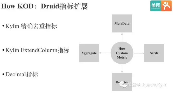 我们目前在Druid中增加了Kylin的精确去重指标,Kylin的ExtendColumn指标和Decimal指标。无论是Druid还是Kylin,我们新增一种聚合指标所要做的事情都是类似的,区别只是具体的接口和实现方式不同。我们自定义一种聚合指标要做这些事情: