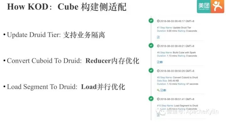 Cube构建侧适配除了之前提到的将Cuboid 转为 Druid Segment和Load Segemnt这一步,KOD中为了支持Druid层的业务隔离,还增加了Update Druid Tier这一步,允许用户将不同的Cube存储到不同的Tier。在Druid Segment生成和Load这两步,都进行了一定的优化。 生成Druid Segment时,由于需要生成倒排索引,所以相比生成HBase的HFILE,就需要更多的内存,所以这一步进行了较多内存升的优化。 在Druid Load Segment这一步,初期发现多个Segment 并发导入时,Druid Load Segment会很慢。 经过排查发现,主要是Druid 0.10.0版本有bug,默认的并发度配置不生效,所以整个Load是串行,后来是通过升级到Druid 0.11,并将并发度设置为磁盘数的2倍解决的,因为Druid Load Segment的耗时99.9% 都是在从HDFS下载Segment上。