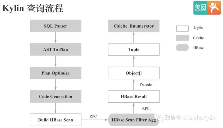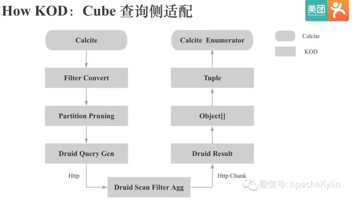 在介绍KOD对Cube查询侧的适配之前,我们先简单看下Kylin的查询流程。Kylin的SQL解析,逻辑计划的生成和优化都是通过Calcite实现的,Kylin会根据Calcite生成的查询计划生成HBase的Scan请求,HBase端经过Scan,Filter,Agg后会一次性将结果返回给Kylin的QueryServer,QueryServer会将HBase返回的结果反序列化,对维度根据字典进行解码生成Obejct数组,再将Obejct数组转为Tuple,Tuple和Obejct数组的主要区别是Tuple有了类型信息,最后Tuple会交给Calcite的Enumerator进行最终计算。