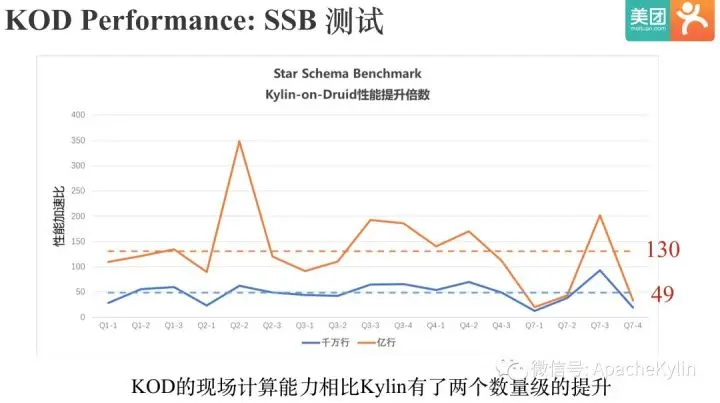 现在为止,我们已经清楚了KOD的整体架构和核心原理。 下面我们来看下,KOD的性能到底怎么样。 首先我们来看下SSB测试的结果,PPT中展示了我们测试的SQL样例和测试环境。 需要特别注意的是:我们在KOD和Kylin都只计算了Base Cuboid,因为如果KOD和Kylin都充分预计算,测试性能基本上没有意义,测试的目的就是为了对比KOD和Kylin的现场计算能力。