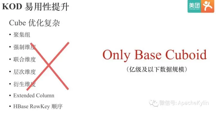前面提到,KOD的现场计算能力相比Kylin有了两个数量级的提升,所以对于亿级及以下数据规模的数据,我们不需要再进行复杂的优化,只需要构建Base Cuboid就可以,用户的易用性有了显著提升。