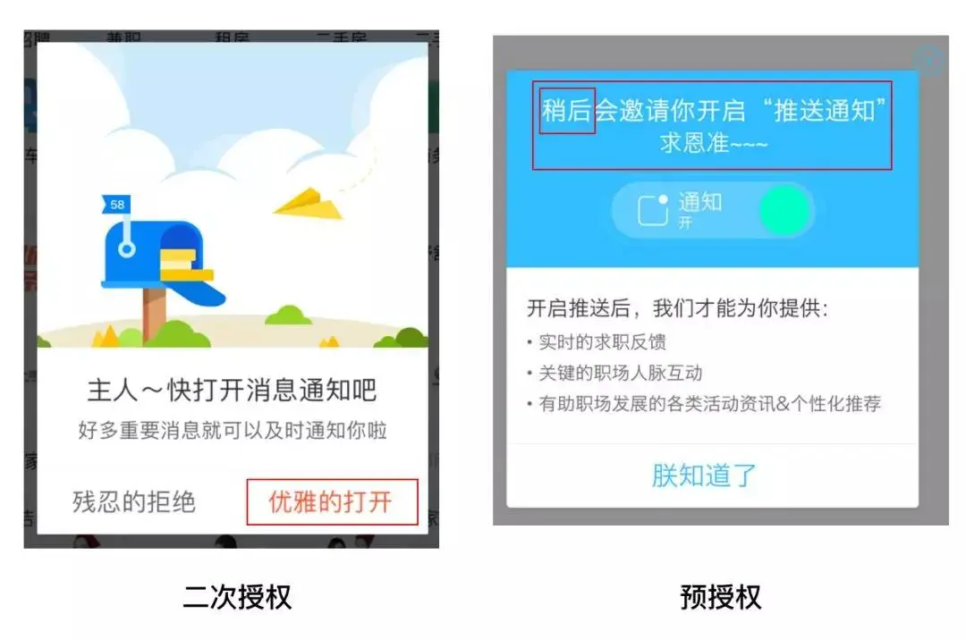 如果iOS用户在第一次拒绝了授权,产品也是有二次授权的机会的,比如电商类产品消息通知的授权,我一般都不会授权,因为不喜欢被促销消息所打扰(这只是我个人习惯,不知道大家是不是也是这样),但是这类授权对电商类产品很重要,再次登录产品时,会弹出二次授权弹窗提醒用户去打开消息通知,但是这里的区别就是,点击授权是利用深层链接(deep-link)直接跳转到系统设置中去打开相应授权,这样就会比较繁琐。还有一类情况是在页面中使用引导的方式去打开权限,无关授权弹窗的内容这里就不多说了。当然还有的产品很聪明,在授权弹窗出现之前会使用预授权机制(pre-permission),先试探一下用户是否会授权,比如会先弹出设计比较美观的弹窗(带有诱导性的文字或是插画),在你点击button后再弹出系统授权弹窗,这样做可以避免二次授权的繁琐,操作成本也会比较高,能这么做的产品还是比较少见的。