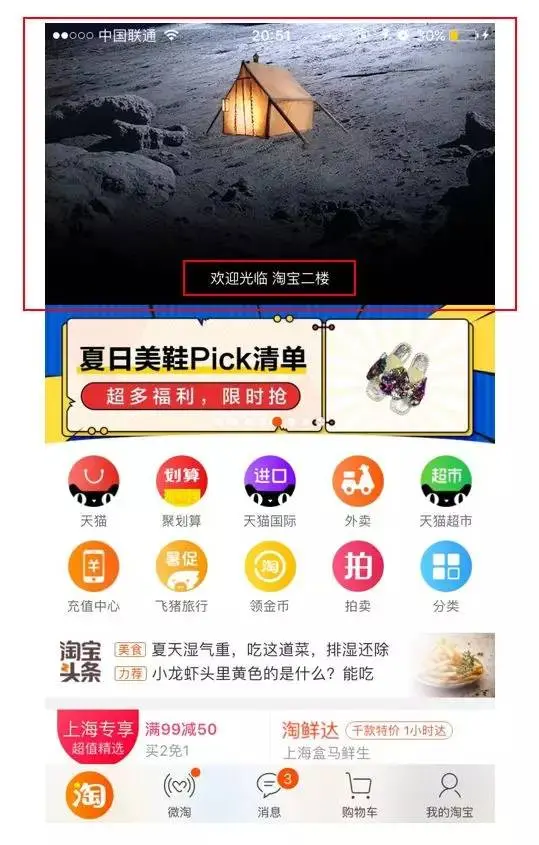 出于运营需要或进行品牌相关的一些宣传、或是关于产品的一些资讯,这类入口通常会在首页分类模块下方,处于页面的中心位置,虽然位置比较突出,但是占的空间不会很大,所以用户对它的关注度可能不会很高;