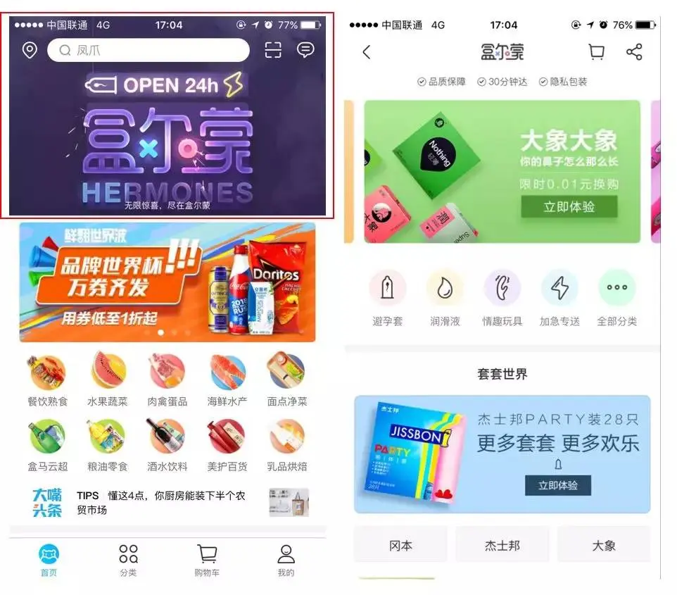 还有一个值得提一下的就是盒马的二楼是“盒尔蒙”业务,是专门卖成人用品的,刚开始知道这个模块的时候有点吃惊,毕竟盒马是一家主营生鲜的电商,竟然玩起了跨界突然开始卖起了成人用品,尺度是不是有点大啊;可能市场上对成人商品的需求比较大,毕竟购买成人用品大部分还是线上购买比较多,毕竟线下购买可能很多人难免会有点不好意思,隐私得不到保证,而且价格比较贵,这样一想盒马想和阿里、网易分一杯羹也可以理解。盒尔蒙的三大竞争力是:品质保障、30分钟达、隐私包装,相信光“30分钟达”这一条就足够有竞争力了,貌似有点扯远了…盒尔蒙为什么要在二楼售卖,可能毕竟盒马的主营业务还是生鲜,总感觉生鲜和成人用品要是杂揉在一起销售难免会有点奇怪,放到二楼可以保证2个模块的独立性,可以互不打扰。