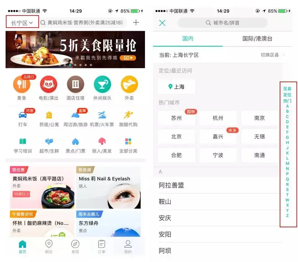 a.美团首页顶部保留着定位功能入口,考虑用户使用场景,用户通过产品可以查看定位城市周边所有团购服务,只需要精准定位到区/县/市等即可,如有查看其它区域需求时,可以方便用户点击进行切换。点击定位后进入定位页面,组成结构:直接搜索城市(方便快速选择新城市)+国内/海外tab+当前城市+切换城市+热门城市+所有城市(字母索引,根据城市首字母排序,可快速找到选择字母下的所有城市)。