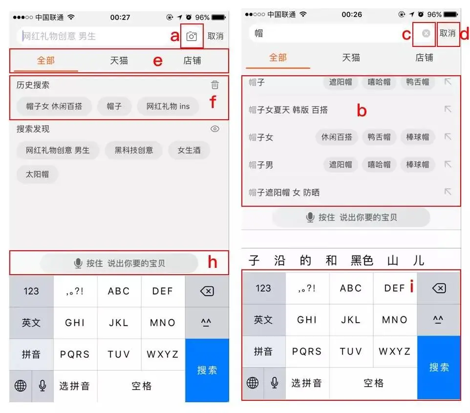 h.语音输入:用户通过语音直接说出关键词,免去输入步骤,可以方便老年人/残疾人或是特殊场景下也能使用搜索功能;