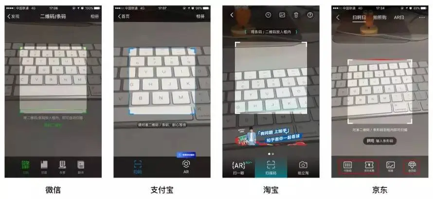 相信扫一扫功能几乎是每天都会用到的功能,二维码付款已经充斥了我们生活的各个方面,微信/支付宝的扫一扫功能相信大家是每天都会用到的,而且这个功能也越来越强大,不止扫描二维码甚至还可以识别手机相册内照片上的二维码;下面找了几个具有代表性的产品分析一下扫一扫的功能:
