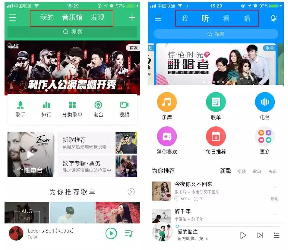 顶部tab式导航:这类导航形式也很常见,常和底部标签式导航搭配使用,作为二级辅助导航样式,一般tab数量3个以上,并且可以进行左右滑动切换;当然也有作为一级导航使用的情况,比如安卓的设计规范中,将顶部tab式导航作为一级导航;再比如QQ音乐,出于产品核心功能需要,音乐播放页面的快捷入口始终置于页面底部,所以主导航就使用了顶部tab式导航;