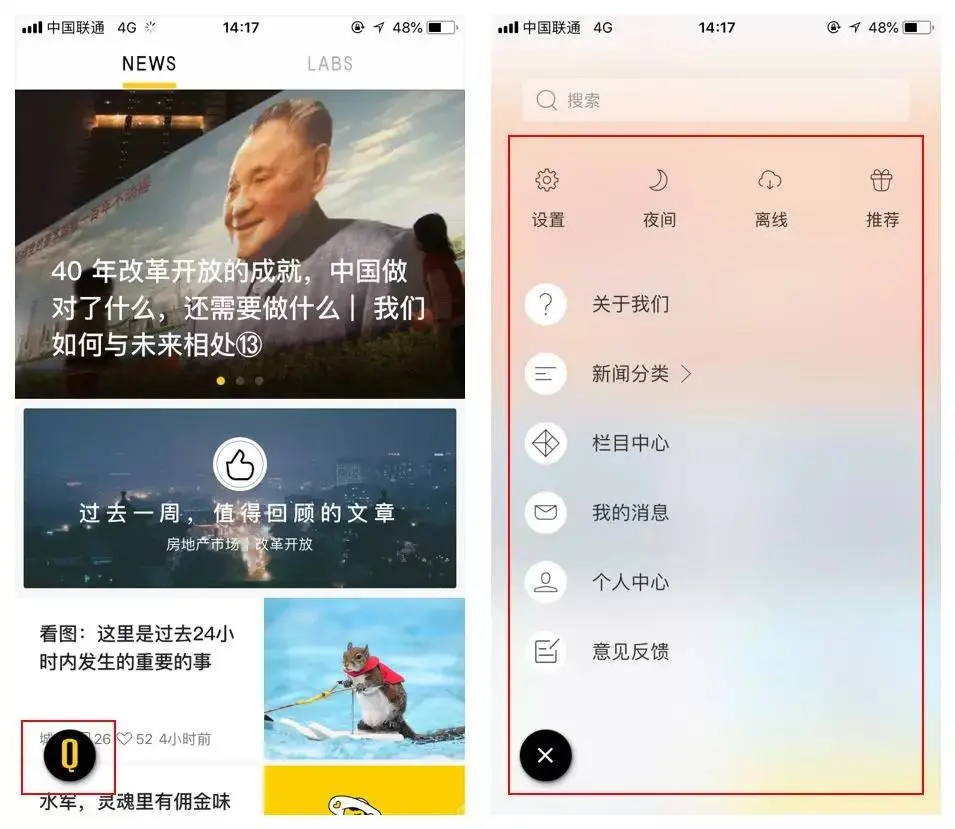 悬浮式导航:这种导航形式也比较常见,现在的手机屏幕比较大,用这种导航方式也越来越多了,常作为二级辅助导航使用,在阅读类或工具类产品中比较常见,;点击导航常伴有动效并出现若干功能,这些功能聚合在悬浮导航内,节省了屏幕空间,但是会对用户的视觉形成干扰;