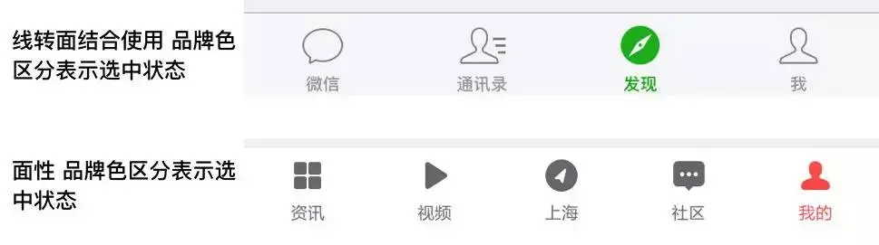 设计上:标签栏高度为98px(@2x),标签栏内的字体作为提示作用,字号为20px;标签的数量一般有3-5个,icon的设计上要保持简约并且能够精准传达释义,也可以进行品牌基因的融入来突出自己的调性和其他产品的差异化;常用的是线性和面性两种,一般进行结合使用以表明选中状态;iOS 11之后面性icon开始流行,用品牌色进行区分;另外 icon的设计要保持统一,比如线性icon的粗细、圆角角度大小、开口的大小等都要保持一致,这样用户看起来也会比较赏心悦目;
