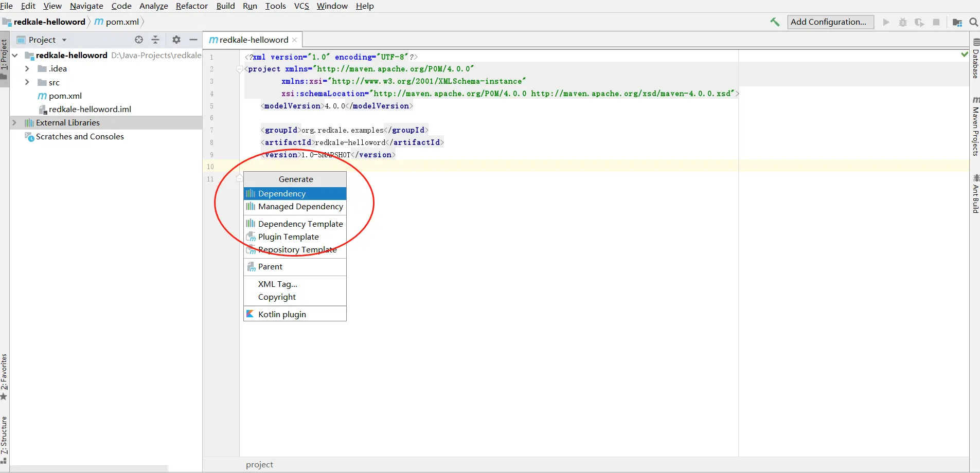 创建完项目后会自动打开pom.xml文件, 按下Alt+Insert组合键添加redkale依赖。