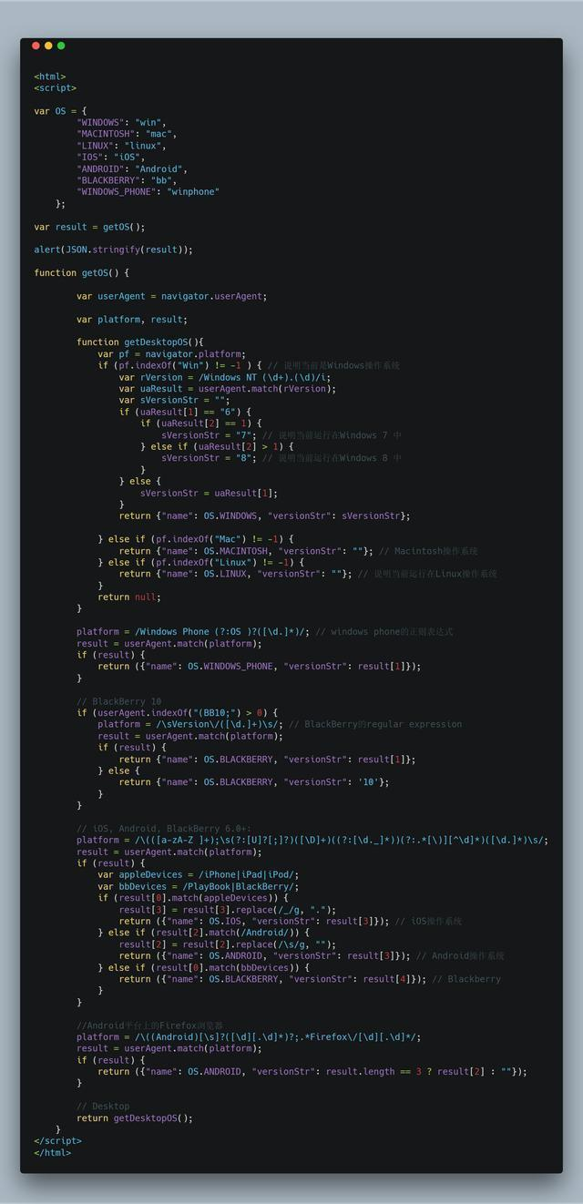 下面这段不到100行的JavaScript代码通过使用正则表达式处理navigator对象中的platform和userAgent字段来判断当前前端应用运行的环境,支持Windows/Linux/Macintosh三种操作系统,iOS/Android/BlackBerry/Windows Phone等移动平台。