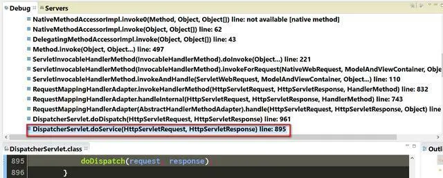 我们通过自己的研究来回答。在上述代码第53行设置断点。再次访问url http://localhost:9098/MavenSandbox/mvc/test1,断点触发。我们观察调用栈,发现有一个栈帧DispatcherServlet.doService(HttpServletRequest, HttpServletResponse)。这个Servlet会负责将我们加了@RequestMapping注解的方法里return的字符串加到HttpServletResponse里,这就是为什么我们在浏览器里能看到return字符串的原因。